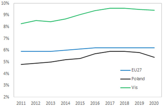 At the same time, Poland has one of the highest employment rates in the energy sector in Europe (Figure 13). We follow the NACE classification, summarizing employment in ‘electricity, gas, steam and air conditioning supply’ and ‘mining’. The percentage of employees working in the sector is more than twice as high as in other Visegrad countries and has significantly increased since 2017. The increase originates from a growth of employment in the mining sector with a simultaneous decline in production. Derski reported [48] three reasons for that, which are geological conditions that require more human labor, relatively high coal prices that encourage new investments, and a shift from external services to employment within the country for political reasons. In light of the discussion in Section 3.1 and Section 3.3 on the strong role of the state and the stark persistence of energy system lock-ins in Poland, we believe that this indicator is an important one for explaining the likelihood of citizen-installed renewable capacities.