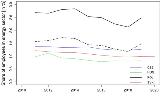 Share of employment in the energy sector vs. all employment (2011–2019/2020). NACE classification, employment in the sectors ‘electricity, gas, steam and air conditioning supply’ and ‘mining’ (also shown separately as dashed line). Source: EUROSTAT [38].