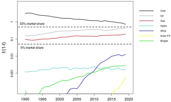 An analysis of the development of market shares of energy technologies in the past decades confirms the overall picture. Figure 14 shows the market ratio of fossil and renewable primary energy carriers f (as f/(1 − f)) over time in a semi-logarithmic plot (Fisher–Pry graph). Notably, renewable energies that would be accessible to citizens only carve out a niche existence, having well below 5% market shares. On the other hand, coal, oil, and gas together take the lion’s share, and little has changed over the past three decades. Clearly, this constitutes a disabling factor for vibrant, multi-actor renewable capacity markets.