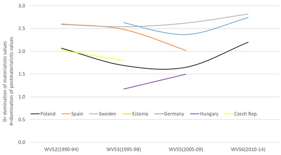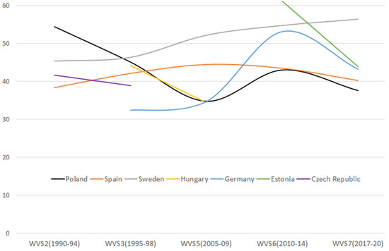 Next, we turn to the discussion of selected societal values. We start with values towards materialism and post-materialism, in which freedom of expression and participation in decision-making constitute a crucial element ([49], p. 1). We believe that a stronger tendency towards post-materialistic values also coincides with attitudes towards participation in the energy transition. As can be inferred from Figure 15, for most of the past few decades, Poland has gravitated towards a group of countries where materialist values are more important than post-materialist ones. More specifically, Poland is located between Western European countries (where post-materialism dominates) and the majority of the Eastern bloc (where materialistic values continue to be more important). Nevertheless, the slowly changing trend in Poland observed from Wave 6 of the WVS [50] indicates that the struggle for day-to-day survival following the collapse of the Iron Curtain is coming to an end. The focus on economic development and physical security broadens by also embracing less materialistic values.
