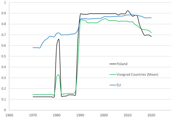 On the other hand, survey data obtained from the Varieties of Democracy project [51] reveal a strong connection between civic engagement (as measured by the civil society participation index) and political system changes; refer to Figure 16. During the early 1980s, the period of temporary liberation of trade union membership was visible, followed by a stark growth in civil society after the collapse of the Eastern Bloc after 1990. At that time, Polish civil society was indexed above the average for the rest of Central and Eastern Europe, and even above the European Union. However, after 2014, we see a significant drop in the index. At present, the levels of indicators concerning the condition of civil society are below the levels for other countries in Central and Eastern Europe, which may indicate barriers to citizen-led renewable capacity projects.