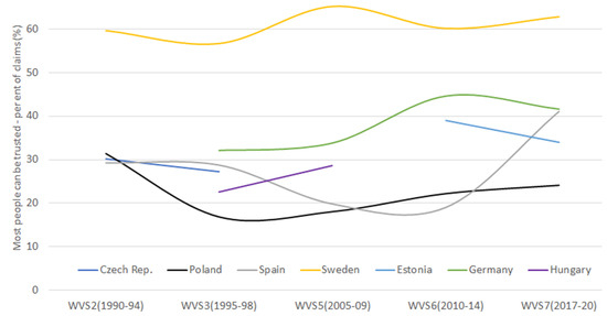 Level of trust in other people (1990–2020). Most people can be trusted (percent of claims). Source: WVS, waves 2–7 [50].