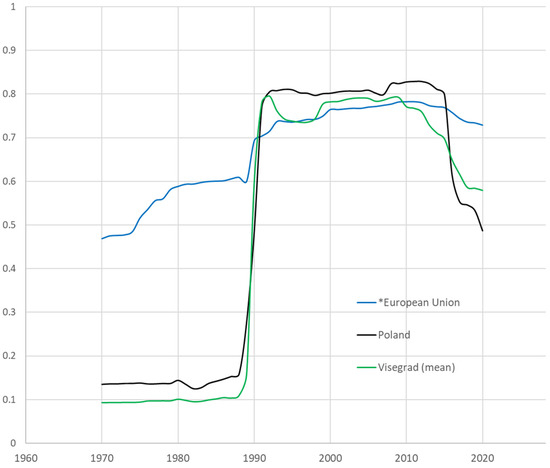 Since 2015, the Polish political system is significantly changing due to legal changes implemented by the Law and Justice party. These developments clearly show up in the trends for the liberal democracy and rule of law indices (Figure 18 and Figure 19). Both of them show a decline since 2015. Note that this is not just the case for Poland but for all Visegrad countries. As regards the long-term trend in confidence towards institutions, Poland also ranks low [50]. We claim that confidence towards selected institutions mimics the level of trust towards public and private entities in general. We use it as an indicator for the effectiveness of government support schemes and educational/promotional programs supporting RES technologies. Figure 20 shows that the indicator dropped continuously from 54% (wave 2) to 43% (wave 6) and 38% (most recent wave 7) [50]. We connect these negative trends with a disabling environment for citizen RE projects.