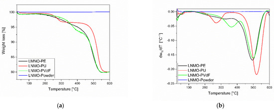 (a) Weight loss normalized to mass variation and (b) Derivatives of the TGA profiles under Ar/O2 of the three electrodes (the aluminum mass has been excluded) and of the pristine LMNO powder.