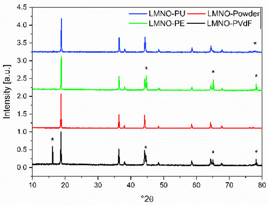 XRD patterns of the pristine LMNO powder and of the LMNO-PU, LMNO-PE, and LMNO-PVdF electrodes. (* Sample holder).