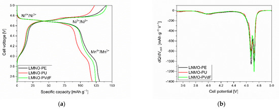 (a) Cell voltage profile vs. specific capacity and (b) derivative of the specific discharge capacity vs. cell voltage at C/10 of the different coin cells assembled with LMNO-PU, LMNO-PE, or LMNO-PVdF.