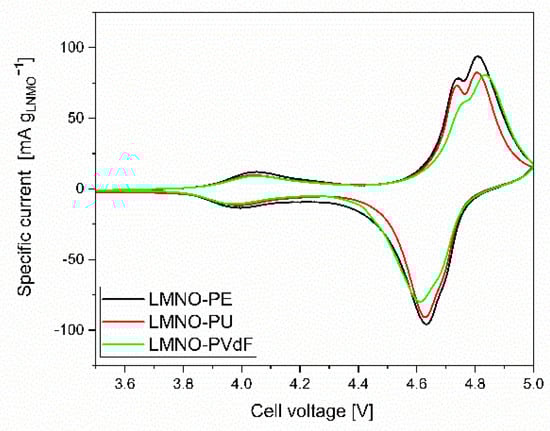 Cyclic voltammogram of the coin cells assembled with LMNO-PU, LMNO-PE, or LMNO-PVdF at 50 μVs−1.