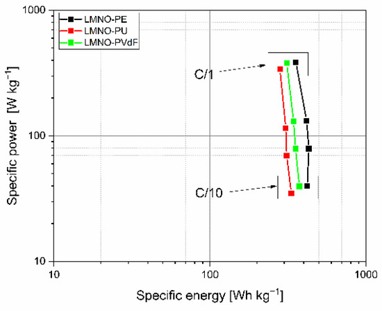 The specific energy and power values reported in Figure 6, are projected data estimated for lithium metal cells assembled with the cathodes detailed in Table 1 and an optimized lithium foil of 15 µm. The highest values can be delivered by cells with LMNO-PE. The specific energy of the cells ranged from 420 Wh kg−1 (at C/10) to 355 Wh kg−1 (at C/1) for LMNO-PE, while the delivered power was between 40 Wh kg−1 and 385 W kg−1, respectively. In these evaluations, current collectors, separators, and electrolyte mass were not included. However, we would like to underline that these values should be considered just as preliminary. Indeed, extrapolation of the results achieved at lab-scale to project upscaled battery performance is a very challenging task that should consider active, composite electrode and electrolyte compositions, composite electrode, current collector, and separator thickness, as well as overall cell size (cylindrical, pouch, or prismatic). In [33], an extremely useful tool for the prediction of full cell performance metrics starting from measurement results on the electrode level was proposed. The impact of “death components” on the gravimetric parameters largely depends on electrode and current collector thicknesses. The higher is the electrode thickness, the higher is the specific energy. In this work, we used thin electrodes; hence, the impact of the separator (1.6 mg m−2) and electrolyte (200 ) masses was not negligible.