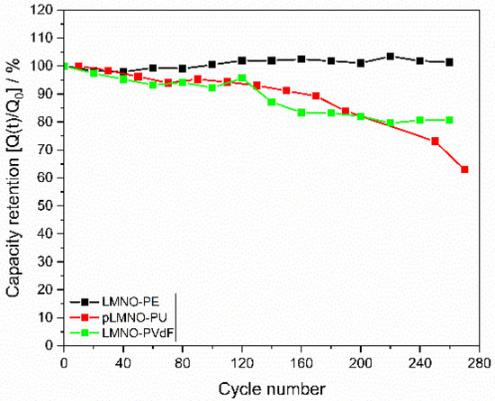 where Q(t) is the capacity delivered at the ith cycle, while Q0 is the value exhibited at the first cycle. The cells assembled with the water-processed cathodes featured outstanding cycle stability. Indeed, LMNO-PU performed like LMNO-PVdF and retained 80% of the initial capacity after 200 cycles. Outstanding is LMNO-PE that features an excellent capacity retention of 100%. This test should be taken as a preliminary one and should be validated by longer cycle-life tests. However, it already clearly demonstrates the better stability of PEDOT:PSS-based cathodes vs. LMNO-PVdF since the first cycles.