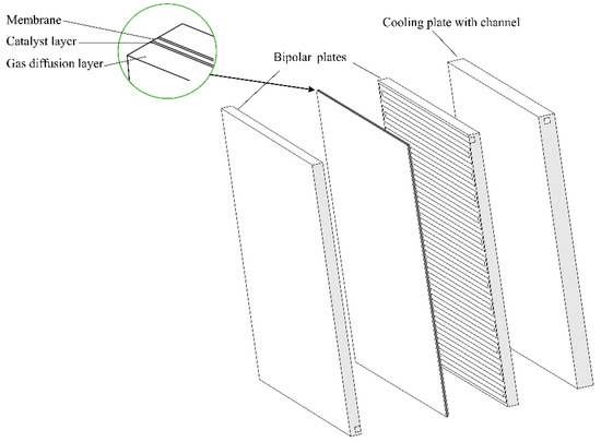 The fuel cell stack consists of multiple fuel cell units stacked together. The cooling plates are distributed at both ends of a single fuel cell and are in close contact with the bipolar plate. The heat generated during PEMFC operation enters the cooling plate through heat conduction in the bipolar plate, and then the heat is taken away by the coolant circulation in the cooling plate. Figure 1 shows the structure of the fuel cell stack.