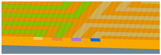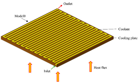 Figure 2 shows the cooling plate model to be calculated. Heat is transported from both sides of the cooling plate during its actual working process. The cooling plate is divided from the central plane according to the cooling plate’s symmetry for ease of calculation, and the half model of the overall cooling plate is analyzed to simplify the calculation. The heat flux acts on the bottom, and the value is a fixed value of 5000 W/m2, which is a common value encountered during typical PEMFC operation. The heat produced by PEMFCs is comparable to the output cell power (with PEMFCs with a rated power of 1 kW, around 1–1.5 kW of heat is produced) [36].