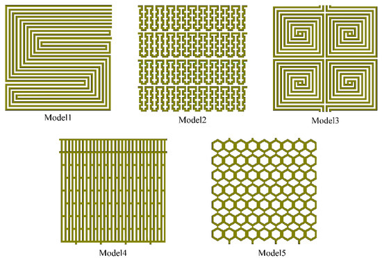 Five different cooling channels are designed, as shown in Figure 3. Among them, model 1 is a multi-serpentine flow field, model 2 is a multi-turn flow field, model 3 is a multi-helical flow field, model 4 is a flow field with a uniform plate, and model 5 is a honeycomb structure flow field. The parameters of the geometric structure are shown in Table 1.