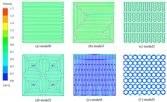 Figure 9 shows the pressure distribution of six different cooling channels, and the inlet mass flow is 0.002 kg/s. As can be seen from the figure, compared with other situations, the pressure distribution of model 4 and model 5 is more uniform. Model 0 and model 2 show the largest pressure difference in the reaction area, and the maximum pressure can reach 49,265.57 Pa and 79,226.62 Pa, respectively. The reason for the large pressure drop of model 0–model 3 is the long coolant transportation distance, while the coolant flow area of model 4 and model 5 is wide, the flow channels cross and connect with each other, and the pressure drop is reduced. The pressure loss produced by the long channel length is avoided due to the large number and small length of model 4 and model 5 channels. Model 1 has four inlets and four outlets in comparison to the serpentine flow field. It can be seen that the multi-inlet and multi-channel design helps to lessen the flow field’s pressure loss. It can be summarized that the pressure drop can be effectively reduced by using a uniform plate flow field and honeycomb structure flow field.