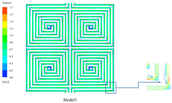 Figure 6d shows the temperature distribution of the multi-helical flow field. It can be seen from the figure that the temperature at the corner of the multi-helical flow field is slightly higher than that of the surrounding environment. This is due to the reflux phenomenon of the fluid at the corner of the cooling channel. As shown in Figure 8, due to the reflux phenomenon, a small part of the fluid stays at the corner and cannot be discharged in time, while the heat of the cooling plate is continuously transmitted to the remaining coolant, resulting in a local temperature difference.
