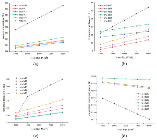Figure 10 shows the effect of heat flux at the bottom of the cooling plate on the average temperature, maximum temperature difference, maximum temperature and temperature uniformity index of the cooling plate. It can be seen from Figure 10a–c that with the increase in bottom heat flux, the average temperature, maximum temperature difference and maximum temperature of the cooling plate increase significantly, among which the traditional single-channel serpentine flow field cooling plate increases the most. In Figure 10c, when the bottom heat flux is 4000 W/m3, the serpentine flow field cooling plate represented by model 0 maintains a good temperature since the heat flux remains within model 0’s heat exchange capacity. When the heat flux is increased to 5000 W/m3, the temperature of model 0 rises significantly due to heat accumulation produced by the serpentine flow field’s lengthy channel. For the maximum temperature difference, the effect of heat flux on the maximum temperature difference of model 2 and model 3 is slighter than that of other types of flow fields. In addition to the traditional serpentine cooling channel, the increase in heat flux has the same effect on the average temperature and maximum temperature of different types of cooling flow fields. For the new designed flow field structure, model 3 and model 4 show the highest temperature uniformity index, which shows that the deviation between the quantitatively measured surface temperature and the average temperature of the heat transfer surface of the flow channel structure is small, the temperature uniformity is high, and it has better heat dissipation performance. This is due to the uniform distribution of cooling channels and weaker blockage of the multi-helix flow field and honeycomb structure flow field.