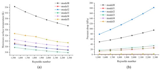 Figure 11a shows the maximum temperature of the cooling plate under different Reynolds numbers of the coolant. The boundary conditions of the numerical simulation are shown in Table 2, where the mass flow rate of the inlet is adjusted to achieve different Reynolds numbers. The results show that the maximum temperature of each type of cooling plate decreases with the increase in Reynolds number, because the larger mass flow at the inlet accelerates the heat dissipation. Figure 11b shows that the increase in Reynolds number will also increase the pressure drop in the channel due to the addition of more fluid flow. The rising trend of the Reynolds number of model 0 and model 2 is faster, because the fluid congestion in these two channels is more likely to occur.