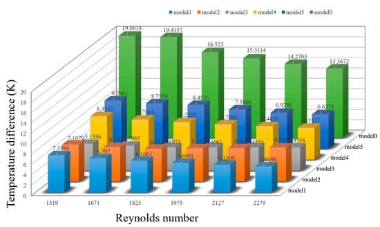 Figure 12 shows the variation in the difference between the maximum temperature and the minimum temperature of each cooling flow field at different Reynolds numbers. The increase in the Reynolds number brings more flow of coolant, which alleviates the polarization of the working temperature of all types of cooling plates and improves the heat transfer capacity of the fuel cell cooling plates. Due to the multi-helical flow field structure with good heat dissipation performance, the temperature difference of model 3 always remains at a low value with the increase in Reynolds number.