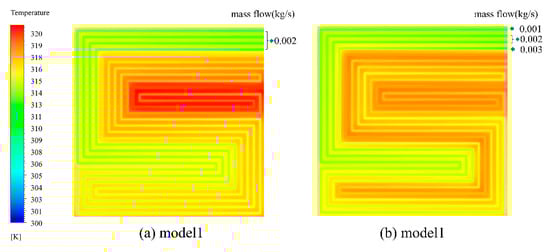 It can be found from Figure 14a that the center temperature of the multi-serpentine cooling plate is high due to the transfer of heat from the inlet to the outlet and the winding of the cooling channel in the middle of the cooling plate. Therefore, the mass flow of the four inlets is redistributed with the total flow unchanged, as shown in Figure 14b, where half of the flow of the external cooling channel is distributed to the internal winding channel. The temperature uniformity at the bottom of the distributed cooling plate is improved, the uniformity index is increased from 0.9978508 to 0.9980883, the maximum temperature is reduced from 321.1978 K to 319.3245 K, the temperature difference is also reduced, and the average temperature is also reduced by 1.2096 K.