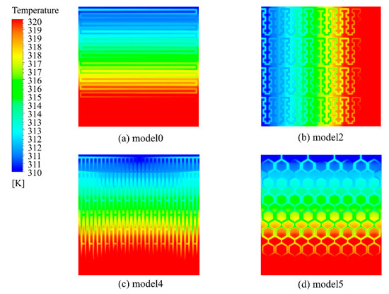 As can be seen from Figure 15, the four models show similar temperature distributions in the case of non-uniform temperature distribution. The highest temperature of the four models is 323.99 K of model 5, and the lowest temperature is 323.9 K; the difference is not obvious. The lowest average temperature is 316.828 K of model 2 and the highest is 316.99 K of model 5. Due to the low temperature in the upstream, the heat exchange capacity of the coolant is small, and the heat exchange is mainly concentrated in the downstream region, which causes the serpentine flow field to avoid the heat accumulation generated by the longer flow channel, thus showing temperature performance similar to that of other flow channels.
