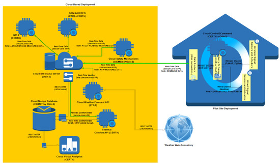 - “Low-cost installations for IMCS”. The ICT P-n-H activities take into account the requirements of low intervention and low installation costs, considering a fully wireless deployment of the necessary automation equipment. To this end, only the metering and actuating devices need to be deployed physically at the building level, while no local server for hosting the software ecosystem is needed since the software deployment is fully on a cloud server. Furthermore, the IMCS software tool, along with the collaborating BMS, OEMS, DRFFO, and Security and Safety Security Mechanisms (SSM) platforms, are designed and implemented to be easily reconfigurable on-the-fly. In addition, they are also capable of re-adjusting their operation according to the scale of the building plant.