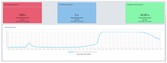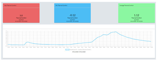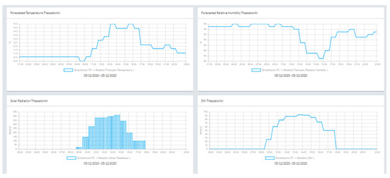 - The thermal-comfort-calculating API, based on the buffered data, and the database manager, which permanently stacks the respective new entries—reflecting the current control cycle—for evaluation purposes in the central data base, are executed while their responses are sent back to the BMS Middleware through the overarching secure JAVA-based channel considered for all data exchanges through the BMS. The input data objects at this level meet the design attributes of “Gateway: Zone Sensors” while the output data objects meet that of “Gateway: Optimization Criterion”. Moreover, in parallel, the OEMS—responsible for emulating the grid behavior, as well as the demand requests of the operator of the grid at the district level—and the weather retrieving API are also initiated in order to collect forecasted weather data for the specified building plant location available in open web repositories (e.g., www.tutiempo.net, accessed on 10 February 2022). Both modules communicate through the same JAVA-based secure channel (as presented in Step 3) with the BMS Middleware. The input data objects as well as the output ones at this level meet the design attributes of “Gateway: Zone Sensors” and “Gate-way: Zones-Block Sensors”, respectively, while the weather forecast API considers void/NULL inputs and “Gateway: WebSource” output objects, respectively.