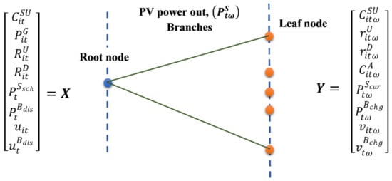 The scenario tree is shown in Figure 1 pictorially explains the recourse’s two-stage decision framework described above. Here, the here-and-now decision vector, , and wait-and-see decision vector, , are represented by the root node and leaf node, respectively, while the branches represent the stochastic process. The number of branches depends on the total number of individual scenarios, , considered for the stochastic process.