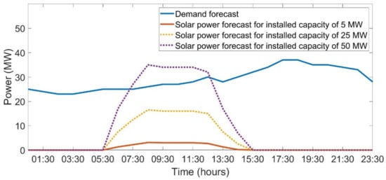 - Most of the island economy revolves around the tourism industry. Therefore, load demand is relatively higher in the evenings. A typical PV power output and load profile of South Andaman is shown in Figure 2. Three PV outputs are considered for Figure 2: the existing 5 MWp PV farm and the prospective PV farm of installed capacities 25 MWp and 50 MWp, respectively. It may be easily observed that for 5 MWp and 25 MWp PV farms, the PV output is lower than the load demand profile, whereas the PV output for 50 MWp PV farm is higher than the load demand. Hence, the significance of BESS is far more substantial in the case of the 50 MWp PV plant as compared to the others. However, this does not eliminate the requirement of BESS for the other two cases, as will be evident in Section 3.2.1.