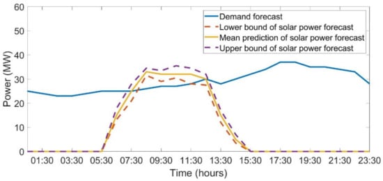 In this work, load demand is represented by point forecasts, while PV power forecasts are treated as a stochastic process with the scenario-based probabilistic forecast. The lower bound, upper bound, and mean PV forecast for a specific day’s prediction is shown in Figure 3. It shows the available range of PV power realization scenarios considered in this work.