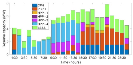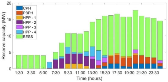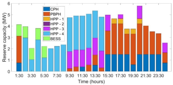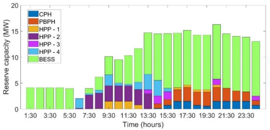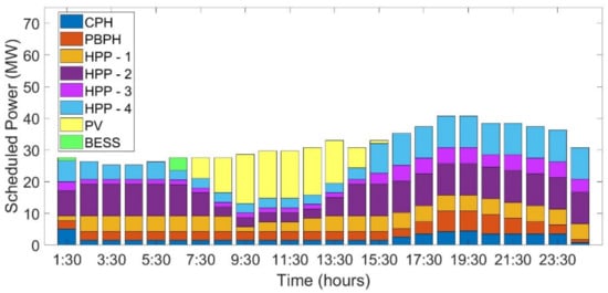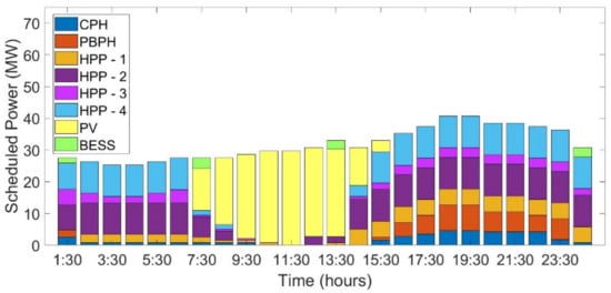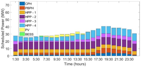 The generation schedule of 24 h for case studies , , and are as shown in Figure 4, Figure 5 and Figure 6. It is observed that the scheduled PV power increases as the installed capacity of the PV power plant increases. On the other hand, the discharging schedule of BESS is close to negligible in cases and . Further, whatever little is scheduled is only because of the initial assumption that 1 MWh and 5 MWh BESS capacity was available from the previous day’s charging. Even in the case of , which has a 50 MWp installed capacity of PV and 20 MWh BESS facility, the actual discharging of power is very small comparatively. This is due to the fact that utilization of BESS is predominantly visible in the up- and down-reserve capacity.