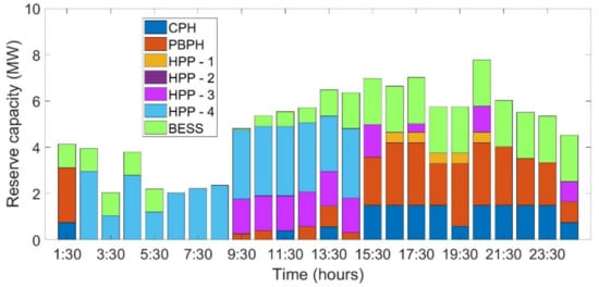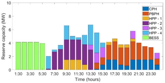 The reserve capacity for case , considering lower bound, mean, and upper bound PV power output realization, is shown in Figure 10, Figure 11 and Figure 12. As seen in Figure 10, for lower-bound power output scenarios from PV, BESS is in a position to offer reserve only based on the initial PV power output. The PV power produced is being utilized for fulfilling load demand and not for charging the battery. Hence, in the lower-bound scenario, BESS is unable to provide reserve once the initial power from the previous day has been scheduled to discharge at 06:30 a.m. (as seen in Figure 5). On the other hand, in Figure 11 and Figure 12, BESS provides reserve even after discharging at 06:30 a.m. since the PV power output realization is different. Unlike the lower-bound scenario, in the mean and upper-bound scenario, PV power output is used to fulfill load demand and is also used for charging BESS. Hence, this charged status makes it possible for the BESS to provide reserve capacity.