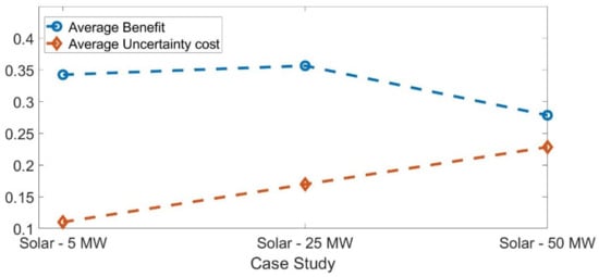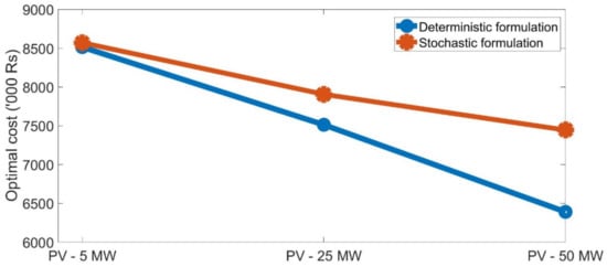 The proposed model was formulated using a stochastic approach based on the recourse framework. If, for the same system, a deterministic model was to be evaluated with mean forecasts acting as point forecasts for the PV power output, then the objective function value of the deterministic formulation and stochastic formulation (considering first-stage variables only) is as seen in Figure 13 for cases (PV—5 MW), (PV—25 MW), and (PV—50 MW). It is observed that the stochastic cost is always more than the deterministic cost. This is justifiable by the fact that by relying on a stochastic formulation, the reserve cost applicable after actual realization in real-time would be relatively lower than the deterministic schedule due to the fact that stochastic formulations consider a wide range of forecast scenarios with different probabilities as opposed to a deterministic formulation, which considers only the mean forecast.