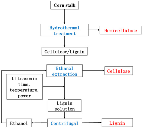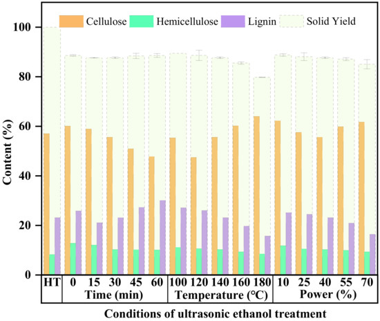 The separation of the components was completed according to the hydrothermal–ethanol method [17,18]. The problem of low lignin removal efficiency was solved by attaching ultrasonic assistance to the second ethanol treatment step. Fixed factors: solids content 5 ω%, ethanol concentration 50 φ%, material as HT, pulse 2 s/8 s. The effects of ultrasonic time, ultrasonic temperature, and ultrasonic power on lignin removal efficiency were investigated in a single-factor test. The ultrasonic generator was selected from an ultrasonic processor (Jy98-222DN, Beijing, China) with 1200 W and φ20 variable amplitude rod, and the ultrasonic power was output in a percentage. The ultrasonic temperature was set at 140 °C, ultrasonic power at 40%, and the experiment was set at the ultrasonic times of 0, 15, 30, 45, 60 min. The ultrasonic time was set to 30 min, ultrasonic power was set to 40%, and the experiment was set with ultrasonic temperatures of 100, 120, 140, 160, 180 °C. The sonication time was set to 30 min, sonication temperature was set to 140 °C, and the experiment was set with sonication powers of 10, 25, 40, 55, 70%. After the treatment was completed, the mixture was filtered through a Brinell funnel, the solid was dried in a blast drying oven at 105 °C to a constant weight, and the liquid was centrifuged to obtain ethanolic lignin. Figure 1 shows the overview of the hydrothermal–ethanol treatment.