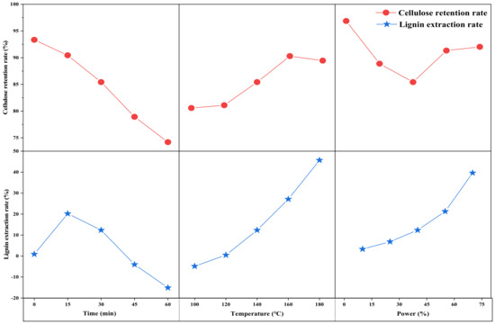 Figure 3 shows the effect of the ultrasonic power factor on the cellulose retention and lignin removal rate of the solid products. As can be seen in Figure 2, the lignin removal rate increased with the increase in ultrasonic power, and the efficiency of lignin removal rate increased, indicating that the ultrasonic power had a significant effect on the release of lignin. The cellulose retention rate decreased and then increased with the increase in power, and the cellulose retention rate reached the lowest value at 40% power. This is mainly due to the cavitation effect of ultrasound, which leads to the breaking of aryl ether bonds in lignin, and the breaking of hydrogen bonds between lignin and cellulose [43,44]. This promotes the release and dissolution of more lignin into the organic solvent. Thus, an increase in ultrasonic power can enhance the cavitation effect, which leads to an increase in the lignin removal efficiency [14,45].