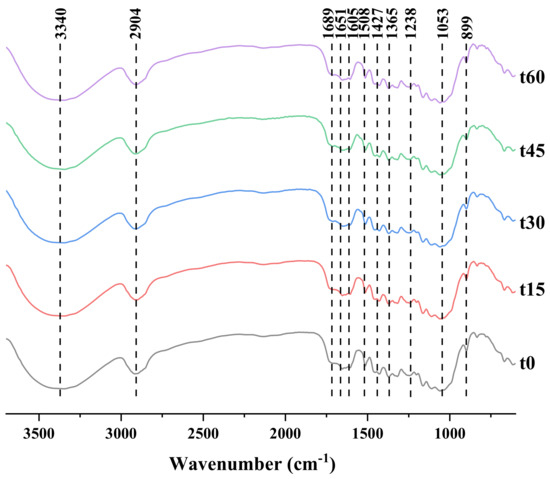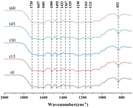 Infrared spectra of corn stalk treated with different ultrasound times.