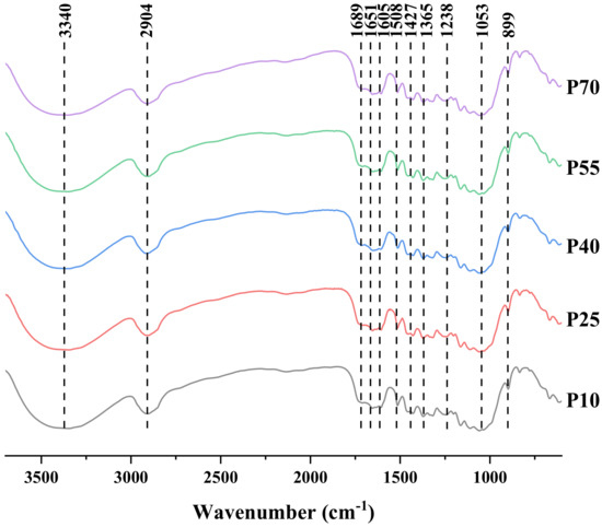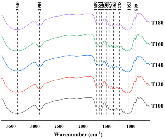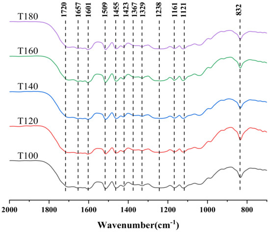 Infrared spectra of lignin obtained by different ultrasonic temperature treatments.