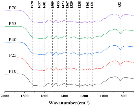 Figure 7, Figure 8 and Figure 9 show the fingerprint regions of the lignin FT-IR spectra. According to the literature, the plots were analyzed to obtain the types of various characteristic peaks [54,55,56,57,58]. The peaks at 1601, 1509, and 1423 cm−1 belong to the benzene ring vibration of the benzene propane skeleton; the absorption peak at 1367 cm−1 demonstrates the presence of S-type and condensed cross-linked G-type lignin structural units; 1238 cm−1 is characteristic of G-type lignin structural units; 1329 cm−1 is characteristic of S-type lignin structural units; the 1121 cm−1 peak indicates the C-H bond deformation vibration in S-type lignin; and 1033 cm−1 indicates C-H bond deformation vibration in G-type lignin. The 832 cm−1 peak is the out-of-plane bending in C2,6 of the S-type lignin unit. The C=O stretching vibration was at 1720 cm−1, the conjugated aryl carbonyl group stretching at was at 1657 cm−1, the C-H deformation and methoxy bending was at 1455 cm−1, and the methyl acetate C-H stretching was at 1367 cm−1. The FT-IR spectra were very similar, and the relative intensities of the characteristic peaks were almost unchanged, indicating similar changes in the chemical structure of the lignin obtained by the ultrasonic ethanol treatment.