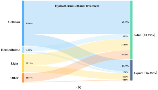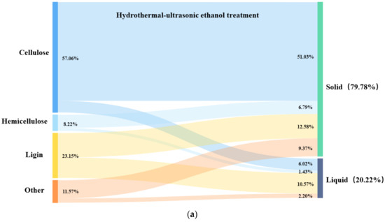 In order to investigate the role of ultrasound in the hydrothermal–ethanol method, the mass flow of the three major components of hydrothermal straw was analyzed. Figure 10a shows the hydrothermal–ethanol method, with the experimental conditions of 180 °C and 30 min, and Figure 10b shows the hydrothermal–ultrasonic ethanol method with the experimental conditions of 180 °C, 40%, and 30 min. Figure 10a,b have the same temperature and time; the only difference is the influence of ultrasound. It can be seen in the Figures that the retention of cellulose, and the removal of lignin can be favorably increased in the solid product obtained with the effect of ultrasound. When compared with the hydrothermal–ethanol method, the cellulose content of 51.03% was much greater than that of 42.27% in the hydrothermal–ultrasonic ethanol method, and the lignin content of 12.58% was lower than that of 14.84% in the hydrothermal–ethanol method.