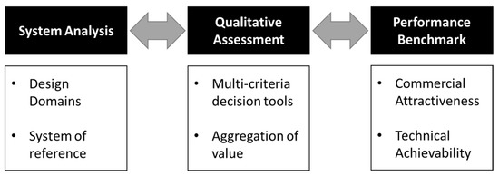 The proposed evaluation approach consists of system analysis, a qualitative assessment and a performance benchmark (i.e., quantitative assessment) as shown in Figure 1. This method merges the engineering design and validation activities together with multi-criteria decision-making and benchmarking. Hence, it enables a comprehensive evaluation of wave energy technologies at various development stages. It is important to highlight the inherent flexibility of the proposed method. For instance, the evaluation approach can be expanded by adding more granularity, i.e., finer levels of details, as the technology matures, or the design focus (i.e., system of reference) shifts from the farm and device to subsystem levels.