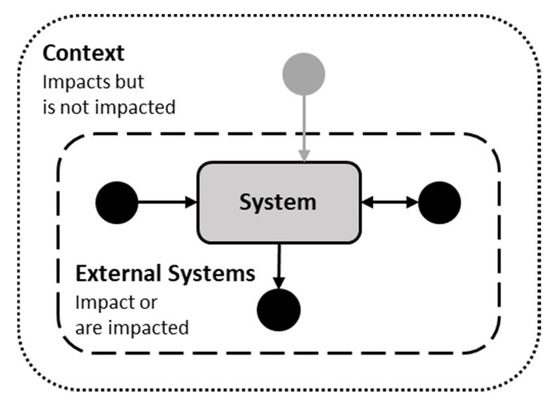 Since any wave energy system can be successively decomposed into smaller entities, the synthesis and analysis activities can be further expanded by repeating the domain mapping process to each subsystem, assembly or component. Regardless of the system scope under consideration, it is essential to identify the entities that interact with it via the system’s external interfaces (i.e., External Systems) and the wider environment where the system is placed (i.e., Context). The External Systems and the Context play a key role in establishing further system requirements [25,26]. Figure 3 depicts the different interactions among the System, External Systems and Context.