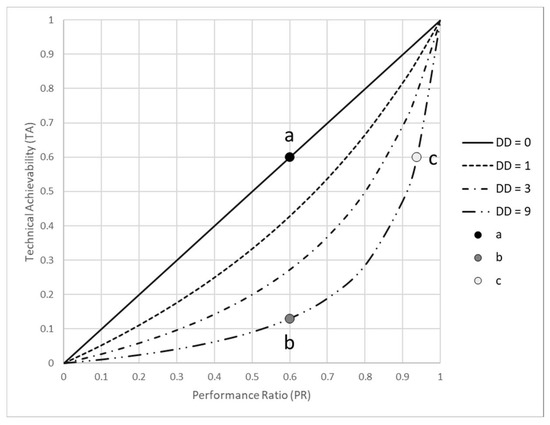 Figure 4 shows four achievability curves for different DD levels. For instance, the TA of one technology with very low uncertainty and PR = 0.6 (point a) is analogous to a technology with a PR = 0.94 (point c) and very high uncertainty, which requires a fundamental breakthrough. Similarly, a technology with very high uncertainty but the same PR = 0.6 (point b) will see its TA severely decrease to 0.13.
