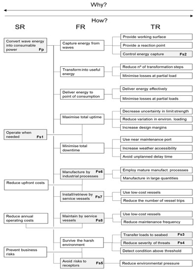 Once the critical system properties are established in the form of wave energy system requirements, evaluation criteria are assigned to offer a credible means by which to assess various design options. Metrics linked to the upper system attributes (i.e., SR) are usually referred to as Measures of Effectiveness (MOE). They are reduced in number since the lower level evaluation metrics are successively derived from them [23]. Measures of Performance (MOP) are used to gauge the FR of a design solution, whilst Technical Performance Measures (TPM) are used to demonstrate successful delivery of the TR. MOP are technology-agnostic, and traceability should be maintained both throughout the decomposition process and with regard to the higher-level MOE. This hierarchy of evaluation criteria ensures a holistic assessment that captures different levels of detail and granularity in the metrics. It is worth noting that the concept of design domains coupled with this fundamental hierarchy of evaluation criteria is also consistent with the basic design processes in the V-model [24], a well-known SE approach.