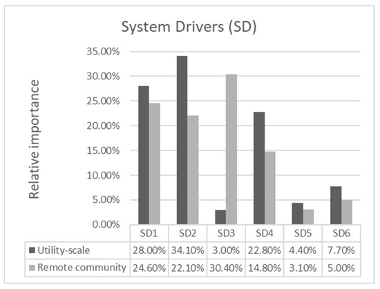 SD interaction and prioritisation is also investigated in [26]. A survey of wave energy representatives was conducted to establish the importance ranking of SD for the two power market applications, namely utility-scale and remote communities’ generation. A total of 64 questionnaires were completed, which represents about 6% of the 1100 full-time jobs in the nascent ocean energy estimated by IRENA [41]. The number of responses would ensure a confidence level of 90% with a 10% margin of error. These values can be considered acceptable to suggest a significant effect when working with small populations and original research topics without previous studies. The proposed method uses AHP to transform this prioritisation of SD into weights. The gradation scale shown in Table 1 is used to perform the pairwise comparisons. Results are presented in Section 4 and the Appendix.