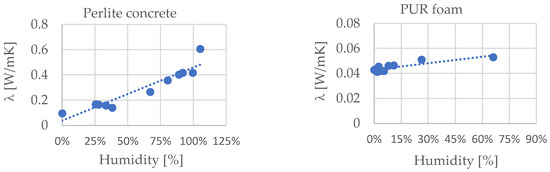 - Measurements of the thermal conductivity λ on a perlite concrete block were taken with a portable device, ISOMET 2114, equipped with a surface probe. Before the tests, the sample had been immersed in water for 21 days; thus, its weight more than doubled. It proves the high porosity and high water absorption capacity of perlite concrete. The measured maximum thermal conductivity λ for the sample before the experiment was 0.0956 W/mK, while for the water-saturated sample, it was 0.6063 W/mK, which increased the value of the coefficient λ by more than six times. The obtained measurement results were interpreted as a graph (Figure 2) showing the correlation between the thermal conductivity and moisture content. The level of moisture content in a perlite concrete block has a great influence on the value of the coefficient λ, i.e., with moisture content w = 30%, the thermal conductivity λ increases to 0.160 W/mK (approx. 70%), and with moisture content w = 50%, it increases by more than 100%. Therefore, using perlite concrete blocks, walls should be built in an air-dry state and sorption moisture. Moreover, during construction, they require protection against rainfall.