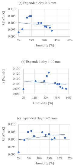 The authors [51] state that in porous bodies, the thermal conductivity of the material skeleton is greater than the thermal conductivity of air. The thermal conductivity of porous bodies increases with an increase in moisture content. For many porous building materials, the coefficient λ increases linearly with an increase to approximately 10% moisture content. It is related to an increase in the intermolecular contact of water, which, filling pores, removes the air from them. For the thermal conductivity of porous materials, the so-called effective thermal conductivity λef should be taken. Its value is determined by the values of thermal conductivity of the porous body skeleton λs and the fluid filling its pores λp (liquid, gas, mixture of liquid and gas) [60]. The work [60] presents a graph of the dependence of the thermal conductivity on moisture content, among others, for pumice stone. The graph shows, as in the case of the results from the tests carried out by the authors of this paper, the tendency consisting in an initial increase in the value of the coefficient λ with an increase in moisture content to 15%, then with increasing moisture, a decrease in the value of the thermal conductivity. The graph has a parabolic shape with a clear tendency for the conductivity to decrease with an increase in material moisture. Similar results were also obtained in the tests for expanded clay described above (Figure 6).