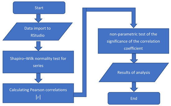 The analyses were performed using the Pearson correlation coefficient, which is expressed by the Formula (7) taken from [56].