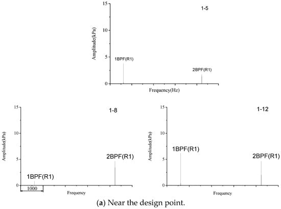 At the current stage, as the key point is the blade sweep effect, the power of which is mainly concentrated on the first two harmonics (namely the 1 blade-passing frequency (BPF) and the 2BPF), the spectrums induced by other flow structures are not discussed in this paper. The extracts of the 1BPF and 2BPF disturbances were conducted with the band pass technique based on the fast Fourier transform (FFT) method. The frequency spectrums of the experimental transient pressures at the 2-1, 2-4, 2-5, 2-6, and 2-9 locations are shown in Figure 6. The 100% rotational speed line and the near design condition were chosen first. It was noticed that the first two harmonics of the R1 blade sweep disturbance (the two harmonics are defined as R1-1BPF and R1-2BPF here) asynchronously varied and did not successively decline along the R1 chord. For example, at the 2-1 location, which is near the inlet of R2, both the R1-1BPF and R1-2BPF disturbances are notable (more than 9% of the , where the is the static pressure rise within R2) and the strength of R1-1BPF was evidently higher than that of R1-2BPF. As the measurement location moved downstream, both of the two disturbances became significantly weak at the location of 2-4. However, this trend was not held further and the strength of R1-1BPF grew again at the 2-5, 2-6, and 2-9 locations. Using location 2-5 as an example, the strength of R1-1BPF grew by 24% relative to the 2-1 location. Meanwhile, R1-2BPF had a similar trend (from the initial drop to the following increase), but its strength growth began at the 2-6 location instead of the 2-5 location. Additionally, it is shown that the sudden increase in R1-2BPF at the 2-6 location (the amplitude increased by about 68% compared to the 2-1 location) was higher than the situation of R1-1BPF at the 2-5 location. Moreover, as the figure depicts, the amplitude of R1-2BPF from the middle (location 2-6) to the rear part (location 2-9) of R2 was higher than R1-1BPF, indicating that the two disturbances propagated differently after their sudden increases. Inferred from the phenomena above, it is concluded that firstly, the strengths of R1 sweep disturbances do not always decrease along the streamline and will be obviously enhanced under the interaction effect of several flow structures at specific locations. Secondly, the flow structures inducing the R1-1BPF and R1-2BPF disturbances are not the same and the interference characteristics of these two structures are also different, the result of which is that the increasing trend of R1-1BPF at the middle part of R2 is not the same as that of R1-2BPF.