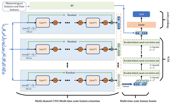 - An MCCNN-TCN model framework was built. Combining the multi-channel 1DCNN model with the TCN model can establish global temporal dependencies between time series features at multiple time scales, which effectively improves the prediction performance.