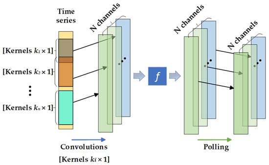 CNN is a great neural network model that uses convolution kernels to extract essential information automatically [46]. Figure 2 shows the basic architecture of the 1DCNN, which can extract latent features in time series using multiple convolution kernels of the same weight. The same convolution kernel obtains a class of related features during the convolution process. Its mathematical model is described as [47]: