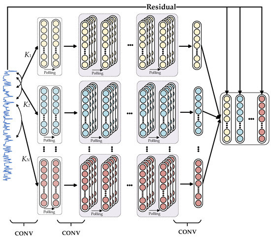Furthermore, earlier research has revealed that when the depth of the neural network increases, residual connections can effectively handle the problems of gradient disappearance and network overfitting [48]. As a result, each channel of the multi-channel 1DCNN is assigned a residual connection in this paper. The residual connection mathematical model is: