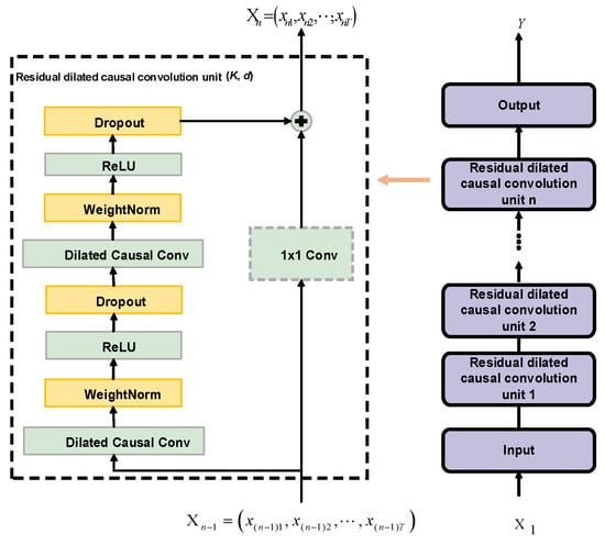 The core of TCN is the residual dilated causal convolution unit (RDCCU), which consists of two rounds of dilated causal convolution with the same dilation factor, WeightNorm layer, activation function, Dropout layer, and residual connections formed by direct mapping of the input [35]. Multiple residual dilated causal convolutional units are connected to form a multi-layer TCN network structure, as shown in Figure 4.